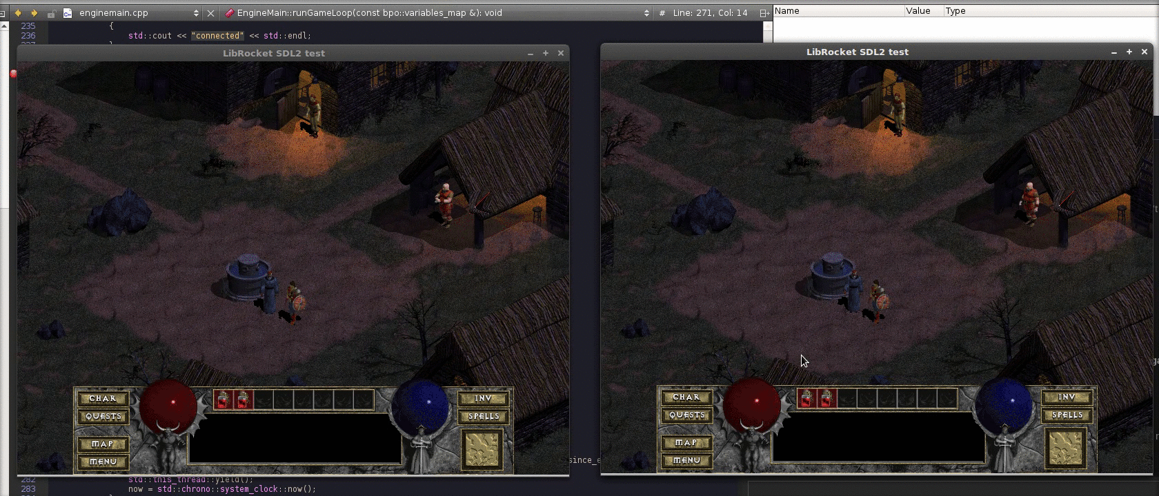 However, freeablo is using SDL for rendering, and libRocket has no native support for SDL. Fortunately, it does have a nice interface for plugging in rendering backends, and someone has written an sdl backend for it (http://mdqinc.com/blog/2013/01/integrating-librocket-with-sdl-2/). Unfortunately, this code was rather tied up in the game engine it was created for, and was not a drop-in solution.